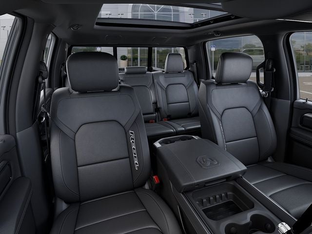 Bed Utility Group (Exterior 115V AC Outlet, MOPAR 4 Adjustable Cargo Tie-Down Hooks, and MOPAR Spray in Bedliner), Quick Order Package 21W Rebel, Rebel Level 2 Equipment Group (115V Auxiliary Rear Power Outlet, 14.4 Touchscreen Display, 2-Door Passive Entry, Front Door Locks, 4G LTE Wi-Fi Hot Spot, Accent Color Door Handles, Accent Color Premium Power Mirrors, Accent Color Tailgate Handle, Apple CarPlay, Auto Power-Folding Mirrors, Auto-Dimming Exterior Driver Mirror, Black Painted Exterior Mirrors Caps, Connected Travel and Traffic Services, Connectivity - US/Canada, Convex Wide-Angle Exterior Mirror Insert, Disassociated Touchscreen Display, Driver Seat Memory, Dual Wireless Charging Pad, Exterior Mirrors Approach Lamps, Exterior Mirrors Courtesy Lamps, Exterior Mirrors with Heating Element, Exterior Mirrors with Memory, Exterior Mirrors with Supplemental Signals, Front Passenger Interactive Display, Global Telematics Box Module, Google Android Auto, GPS Antenna Input, GPS Navigation, Harman/Kardon 19 Speaker Premium Sound, HD Radio, Heated Second Row Seats, Integrated Center Stack Radio, Integrated Voice Command with Bluetooth®, Media Hub with 2 Charge Only USBs, Off-Road Information Pages, Power 2-Way Passenger Lumbar Adjust, Power Adjust 8-Way Front Passenger Seat, Power Adjustable Pedals with Memory, Power Tailgate, Proximity Approach/Departure Lamps, Radio: Uconnect 5 Nav with 14.4 Display, Radio/Driver Seat/Mirrors/Pedals Memory, Rain Sensitive Windshield Wipers, Rear Window Defroster, Security Alarm, SiriusXM Radio Service, SiriusXM with 360L, Smartphone as a Key Capable, and USB Host Flip), 10 Speakers, 3.92 Rear Axle Ratio, 4 Way Front Headrests, 4-Wheel Disc Brakes, ABS brakes, Active Noise Control System, Air Conditioning, Alloy wheels, AM/FM radio: SiriusXM with 360L, Apple CarPlay/Android Auto, Auto High-beam Headlights, Auto-dimming Rear-View mirror, Automatic temperature control, Black Exterior Mirrors, Brake assist, Bucket Seats, Cloth/Vinyl Bucket Seats, Compass, Delay-off headlights, Dome Dual LED Reading Lamp, Driver door bin, Driver vanity mirror, Dual front impact airbags, Dual front side impact airbags, Dual-Pane Panoramic Sunroof, Electronic Stability Control, Front anti-roll bar, Front Bucket Seats, Front Center Armrest w/Storage, Front dual zone A/C, Front fog lights, Front License Plate Bracket, Front reading lights, Front Seat Back Map Pockets, Front wheel independent suspension, Full Length Upgraded Floor Console, Fully automatic headlights, Garage door transmitter, Heated door mirrors, Heated Front Seats, Heated front seats, Heated Steering Wheel, Heated steering wheel, Illuminated entry, Leather steering wheel, Low tire pressure warning, Manual Folding Exterior Mirrors, Navigation System, Occupant sensing airbag, Outside temperature display, Overhead airbag, Overhead console, Panic alarm, ParkView Rear Back-Up Camera, Passenger door bin, Passenger vanity mirror, Power 2-Way Driver Lumbar Adjust, Power Adjust 8-Way Driver Seat, Power door mirrors, Power driver seat, Power steering, Power windows, Radio data system, Radio: Uconnect 5 Navigation with 12.0 Display, RamBox Cargo Management System, Rear 60/40 Folding Seat, Rear anti-roll bar, Rear seat center armrest, Rear step bumper, Remote keyless entry, Speed control, Split folding rear seat, Steering wheel mounted audio controls, Tachometer, Telescoping steering wheel, Tilt steering wheel, Traction control, Trip computer, Variably intermittent wipers, Voltmeter, and Wheels: 18 x 8.0 Painted Mid-Gloss Black.
