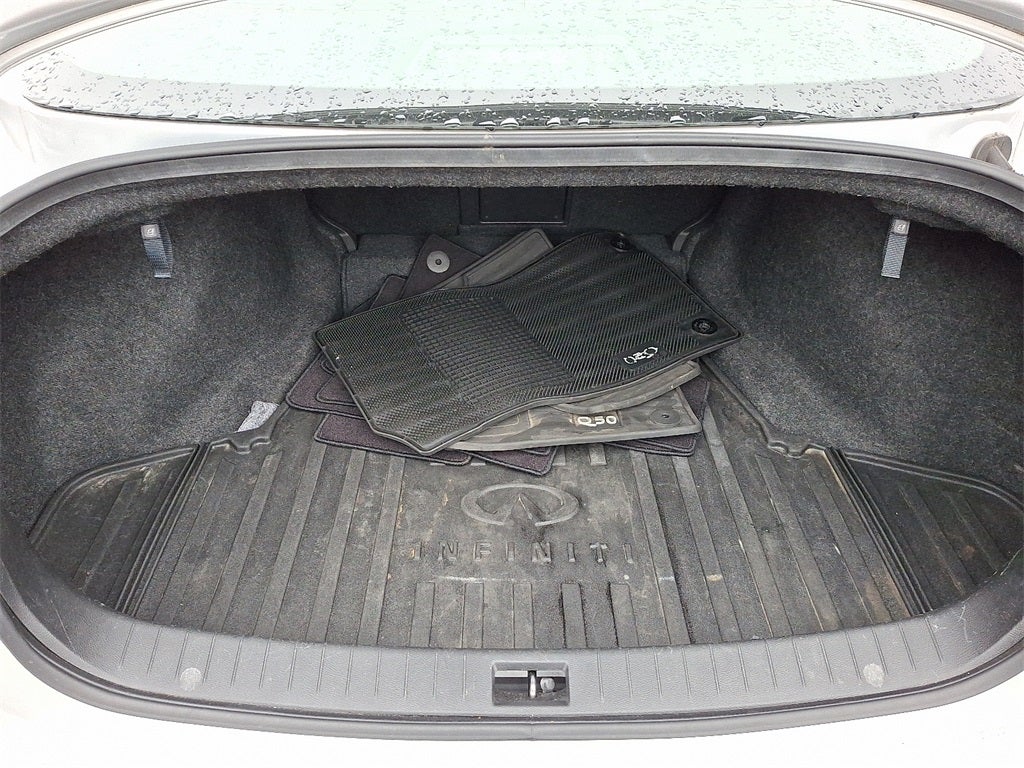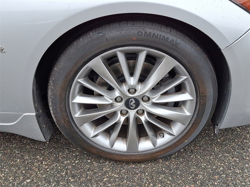 Inside, the Q50 exudes elegance and refinement. Genuine wood accents on the console, dashboard, and doors combine with leatherette seating surfaces, leather shift knob, and leather-wrapped steering wheel for a rich, upscale cabin environment. Heated door mirrors, dual-zone automatic climate control, and a power moonroof elevate comfort and convenience, while the spacious interior accommodates passengers with a premium feel throughout.