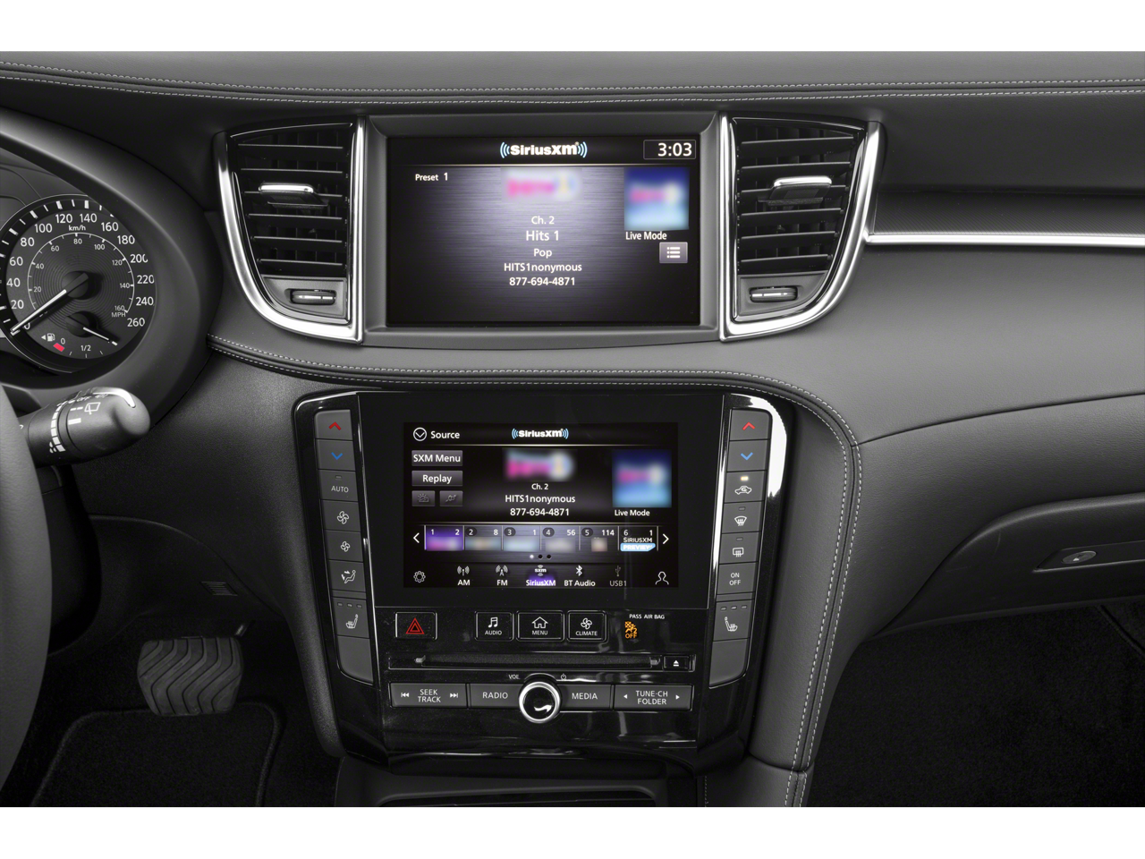 - Radio: AM/FM Audio System -inc: 6 speakers, INFINITI InTouch dual display system w/upper 8" and lower 7" touch screens, wireless Apple CarPlay, Android Auto, HD Radio technology, SiriusXM radio w/advanced audio features and 90-day complimentary trial, INFINITI voice recognition, INFINITI InTouch services, Siri eyes free and Wi-Fi hotspot